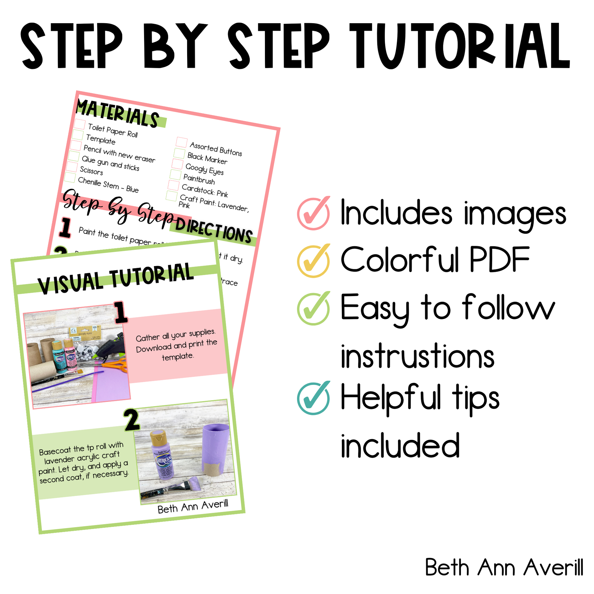 A PDF with clear, step-by-step visual instructions for creating a butterfly character from a toilet paper roll