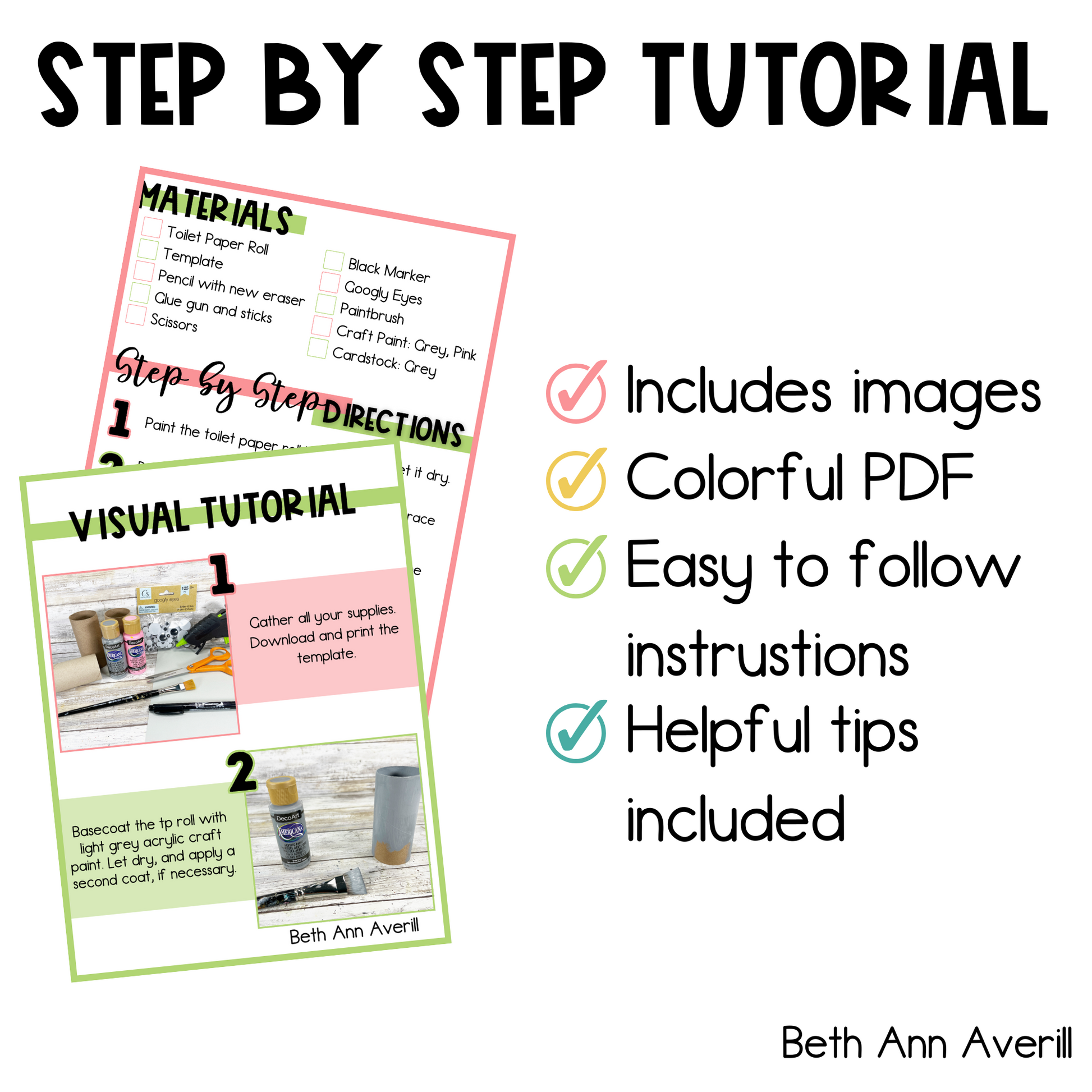 A PDF with clear, step-by-step visual instructions for creating an elephant character from a toilet paper roll