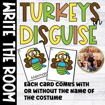 - Each disguised turkey card has two varieties. One is the name of the costume underneath. The second is just the turkey in their costume, and the student has to name it.